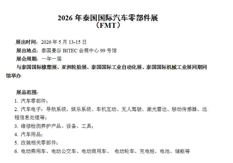 2026 年泰国国际汽车零部件展 时间:2026 年 5 月 13-15 日 地点:泰国曼谷 BITEC 会展中心 99 号馆 周期:一年一届 与泰国国际橡塑展、亚洲轮胎展、泰国国际工业自动化展、泰国国际机械工业展同期同馆举办 联系人:颜女士 15801674939同V, A3056964141同V 汽车零部件;汽车电子:维修检测养护产品、设备、工具;汽车用品;改装相关零部件;电动乘用车、电动公交车、电动商用车、 电动轮车、充电桩、电池、储能等