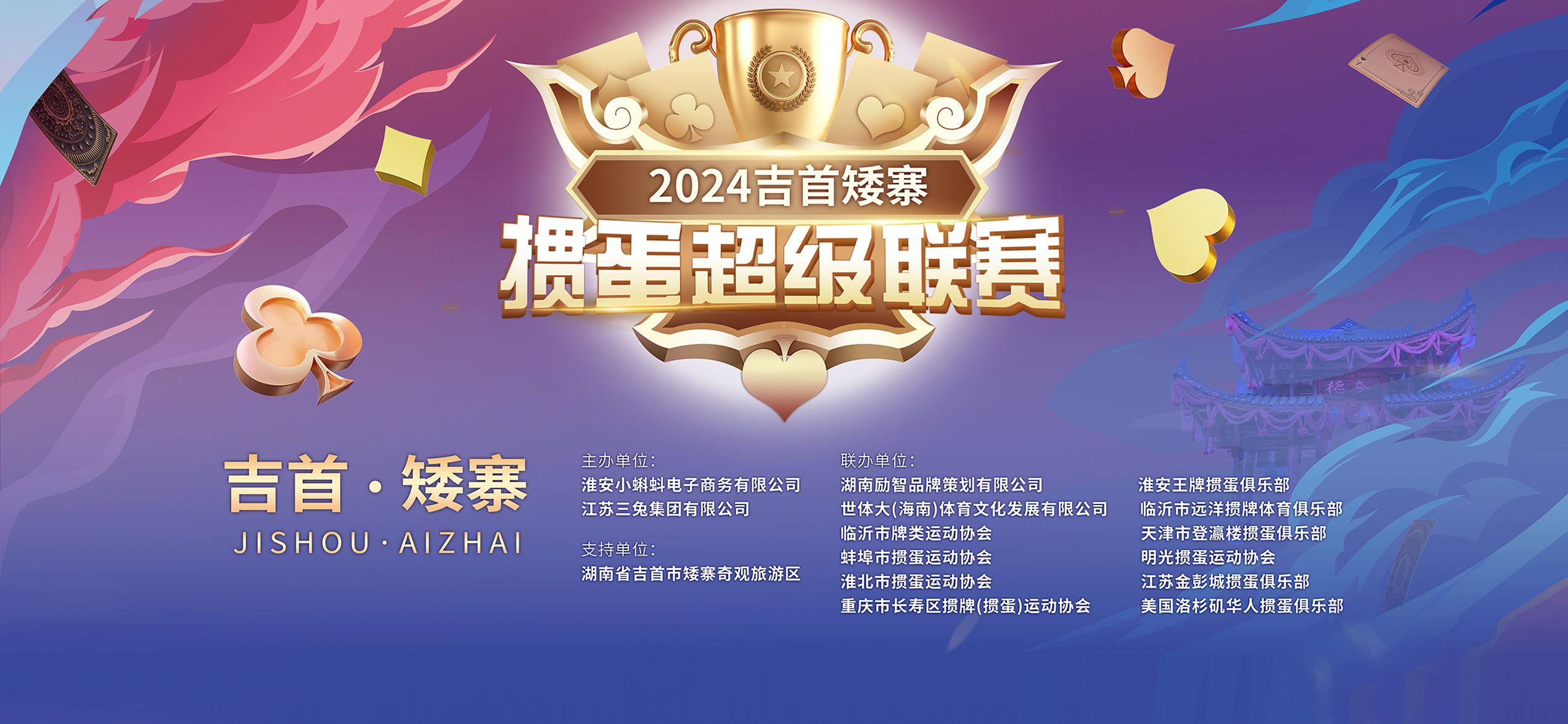 2024吉首矮寨掼蛋超级联赛分为全球城市赛、预热赛和总决赛,联赛自8月31日持续至10月20日,三场赛事需单独报名,赛制为双人组队积分赛,快来加入这场精彩纷呈的活动吧!